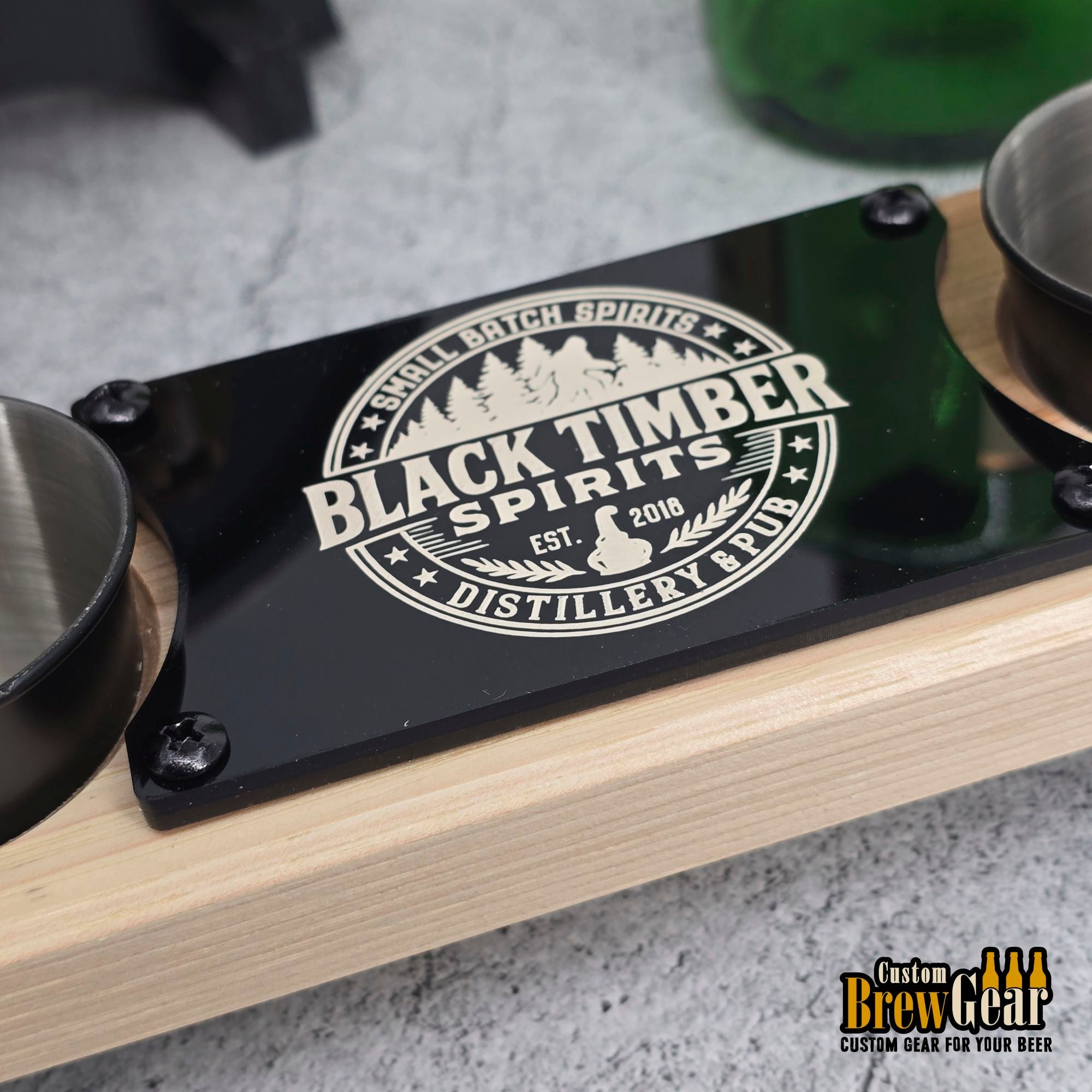 Made from solid hickory and featuring a high-contrast black acrylic logo plate, each board is built to impress. The laser engraving reveals crisp white details—perfect for highlighting your distillery name, logo, or custom text. Whether you use your branding or personalize our template, your setup will look sharp and unforgettable.
